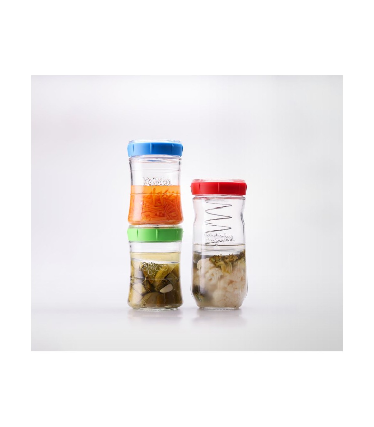 De Kefirko Veggie Fermenter 900 ml is een complete set om groente veilig en eenvoudig te fermenteren. Dankzij het slimme ventilatiesysteem, de persveer en het glasgewicht blijft je groente onder de pekel en kan zuurstof niet naar binnen. Zo maak je zonder gedoe zelf zuurkool, kimchi, knoflook, wortels of ingemaakte groentes.
